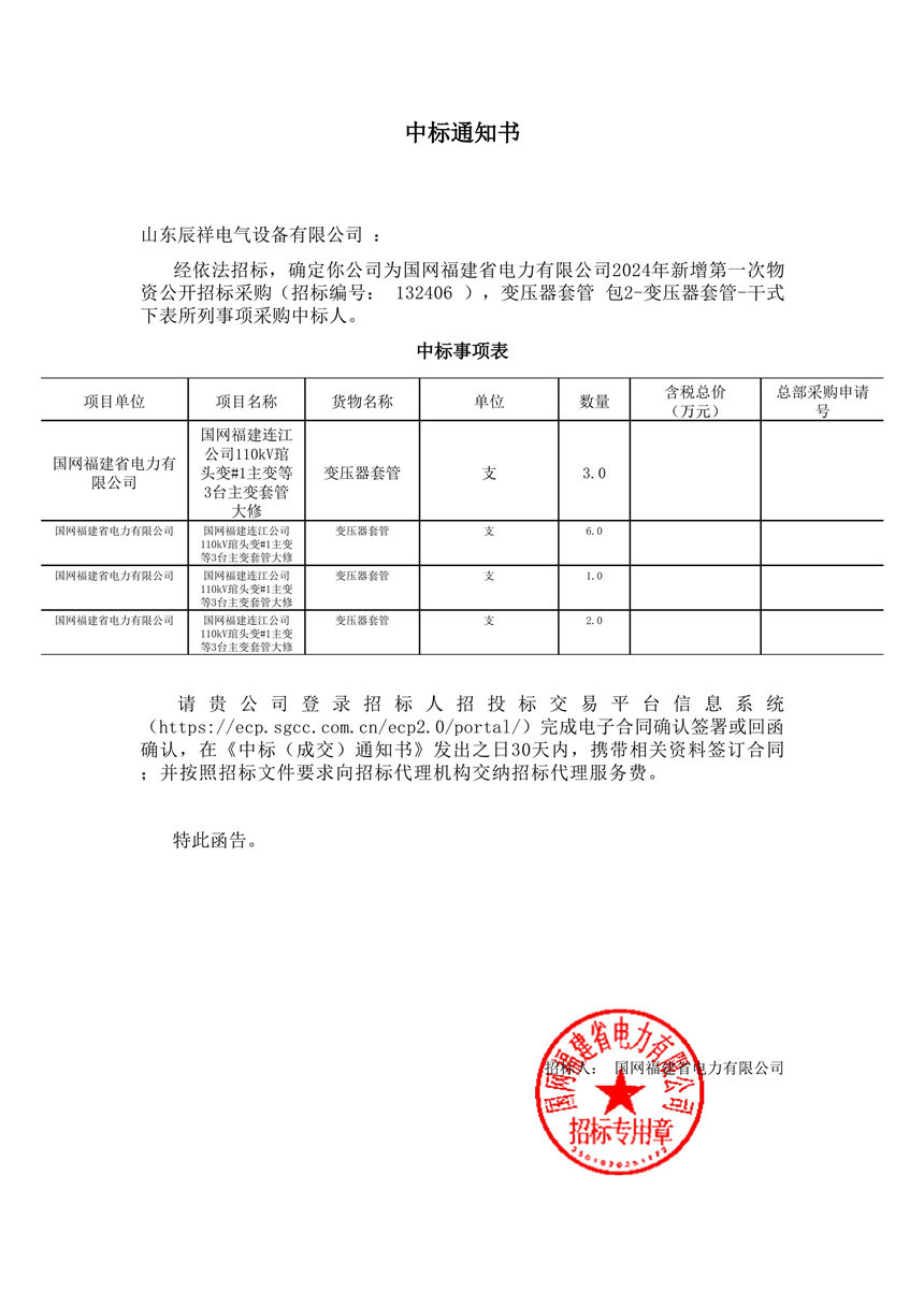 • 2025.02.14 110kV瓷絕緣穿墻套管中標通知書